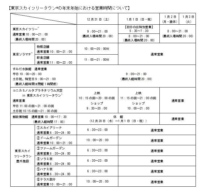 東京スカイツリーでは、年始における営業時間の一部を変更し、東京スカイツリーで「初日の出等別営業」や三が日の早朝営業を実施します。