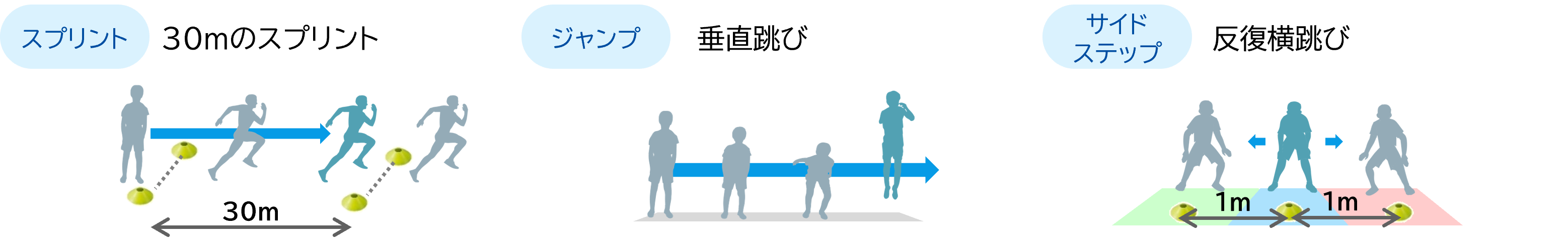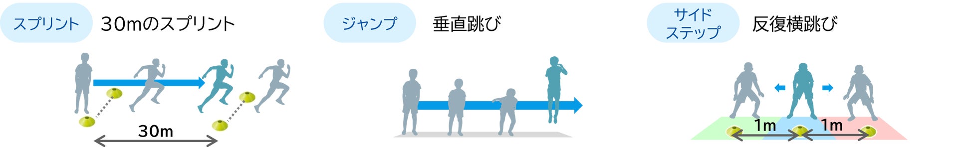 本サービスでは、人の動きをセンシングするエプソン独自のモーションセンシング技術「M-Tracerテクノロジー」搭載の小型センシング端末を装着して、ダッシュ、ジャンプ、俊敏な方向転換など運動の基本動作をすることで、タイム・高さ・回数などの計測だけでなく、体の詳細な動きの解析を行います。