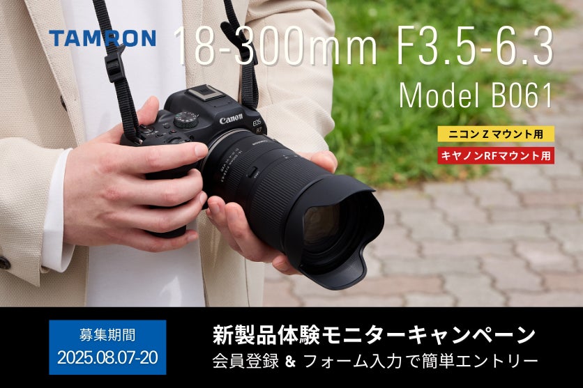 総合光学機器メーカーの株式会社タムロン(本社:さいたま市)は、APS-Cミラーレス一眼カメラ対応ニコン Z マウント用、キヤノンRFマウント用高倍率ズームレンズ「18-300mm F/3.5-6.3 Di III-A VC VXD (Model B061)」の発売を記念して、体験モニターキャンペーンを実施いたします。