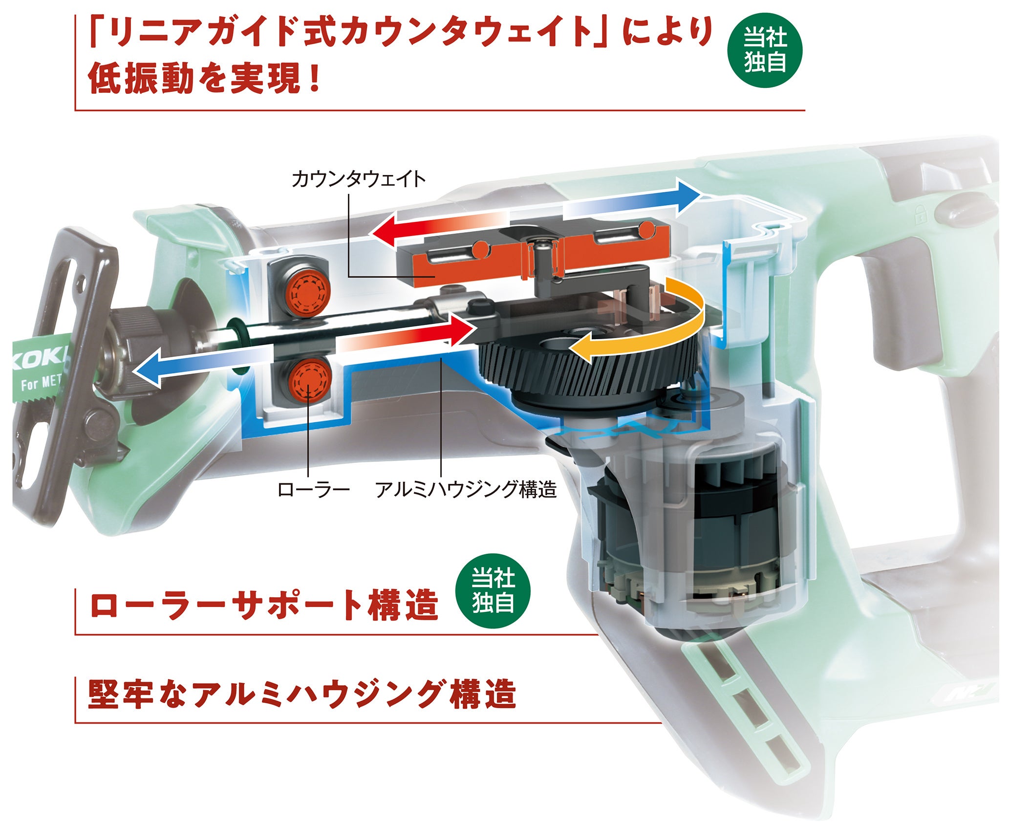 今回発売したCR 36DMAは、軽量・コンパクトで狭所や高所の作業での取り回しに優れ、さらにショートタイプでは最速クラスの切断スピードを発揮し作業効率を向上させます。また、当社独自の低振動機構「リニアガイド式カウンタウェイト」により、切断時のバタつきを抑え、疲労を軽減する他、先端軸受け部分の「ローラーサポート構造」により、摩擦による摩耗・発熱を低減させ、軸受け部の耐久性を向上しました。さらに、駆動部の保持を堅牢な「アルミハウジング構造」にすることで、不意な落下による衝撃等からも部品の精度を保ちます。床下などの狭い場所や暗所での作業に役立つ高輝度LEDライトや、材料に合わせて速度を4段階に変更できる等、多様な作業に対応する便利な機能を備えています。