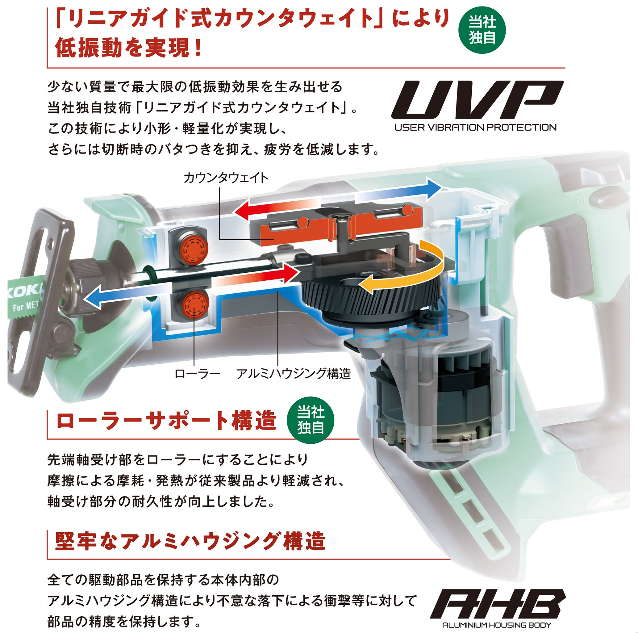 当社独自の低振動機構「リニアガイド式カウンタウェイト」により、小形・軽量化と低振動を実現。切断時のバタつきを抑え、作業者の疲労を軽減させます。