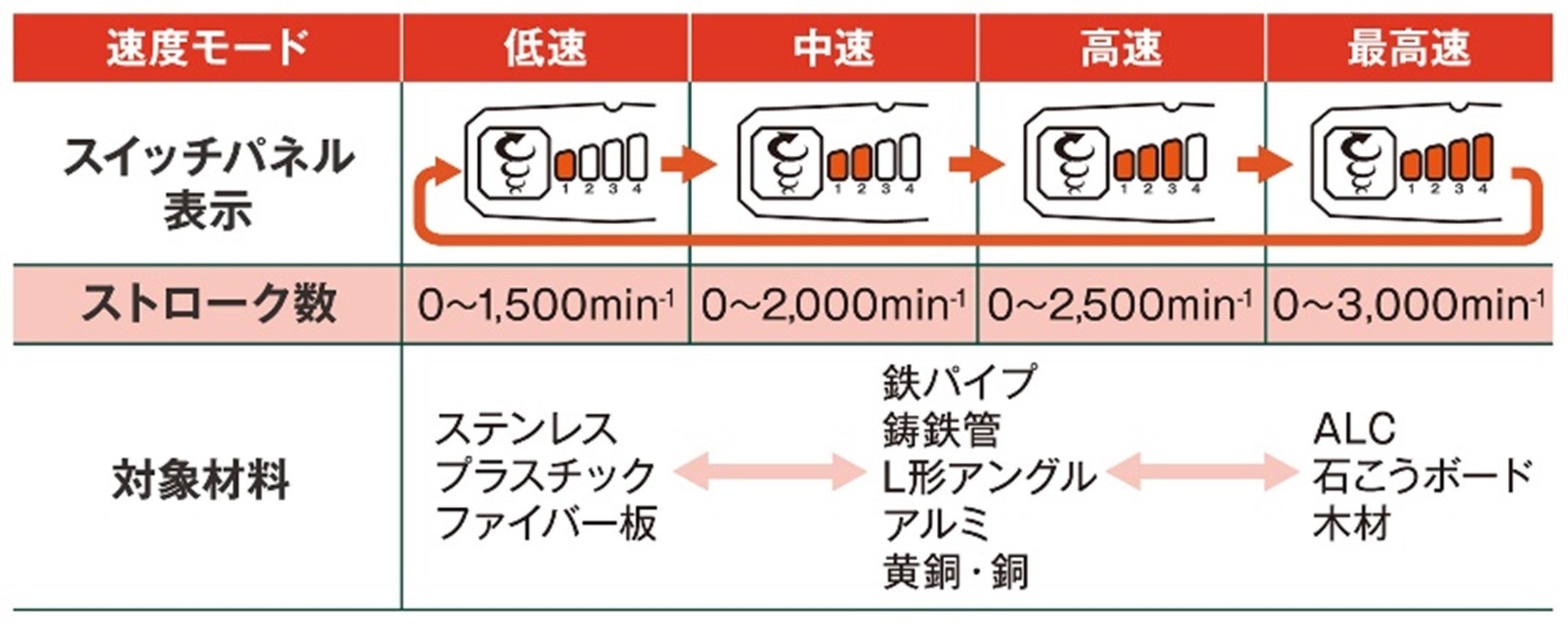 手元のスイッチ操作で、作業内容に合わせたストローク数を選択できます。