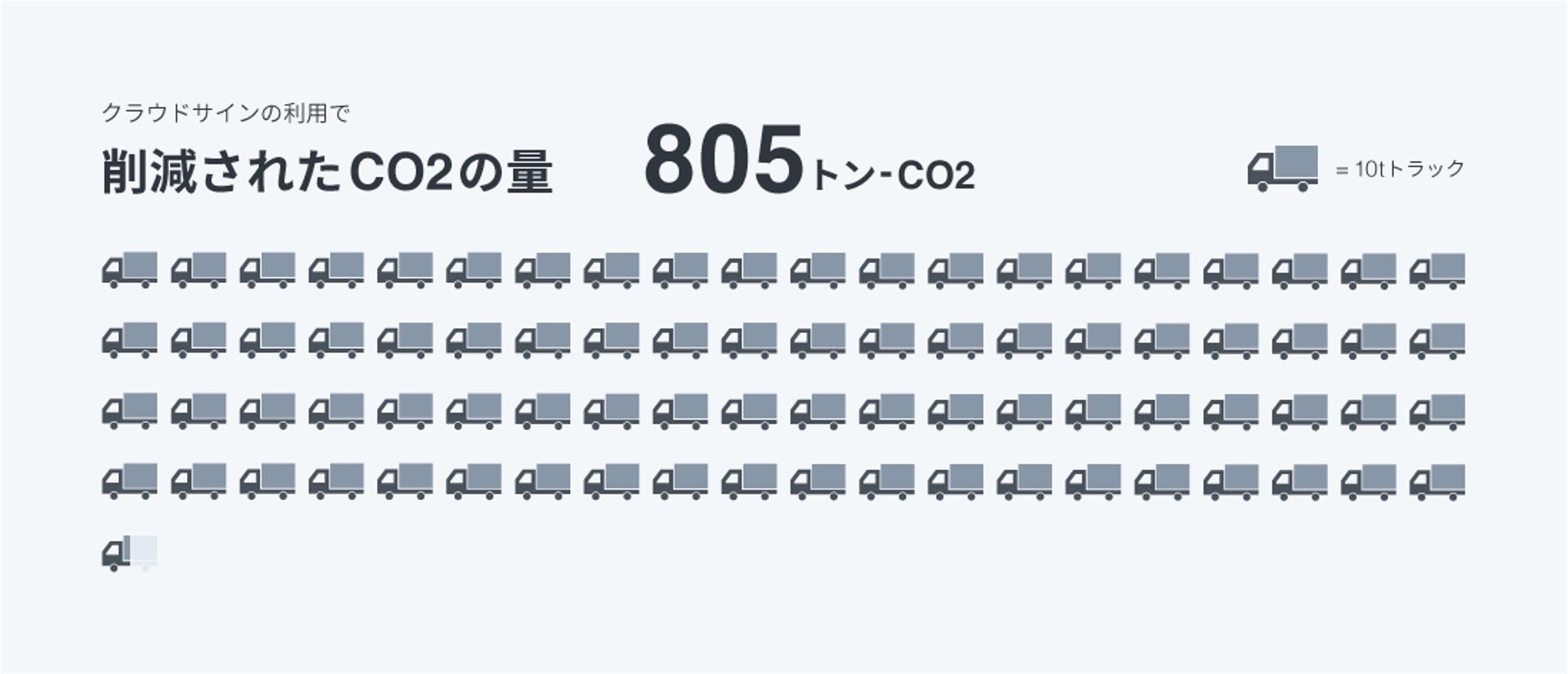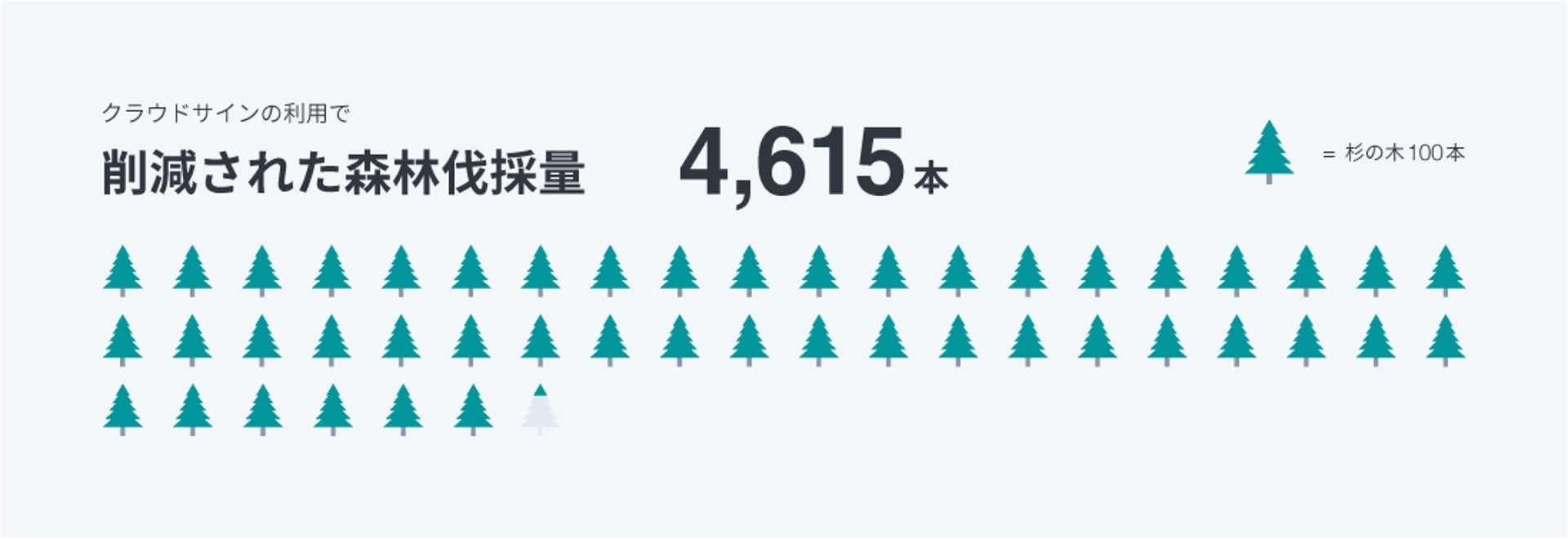環境面においても、契約書のデジタル化は1,000万件の利用ベースで、6,000万枚※1の紙の削減805トン※2のCO2 削減、4,615本※3の木の削減と同等の効果が得られています。