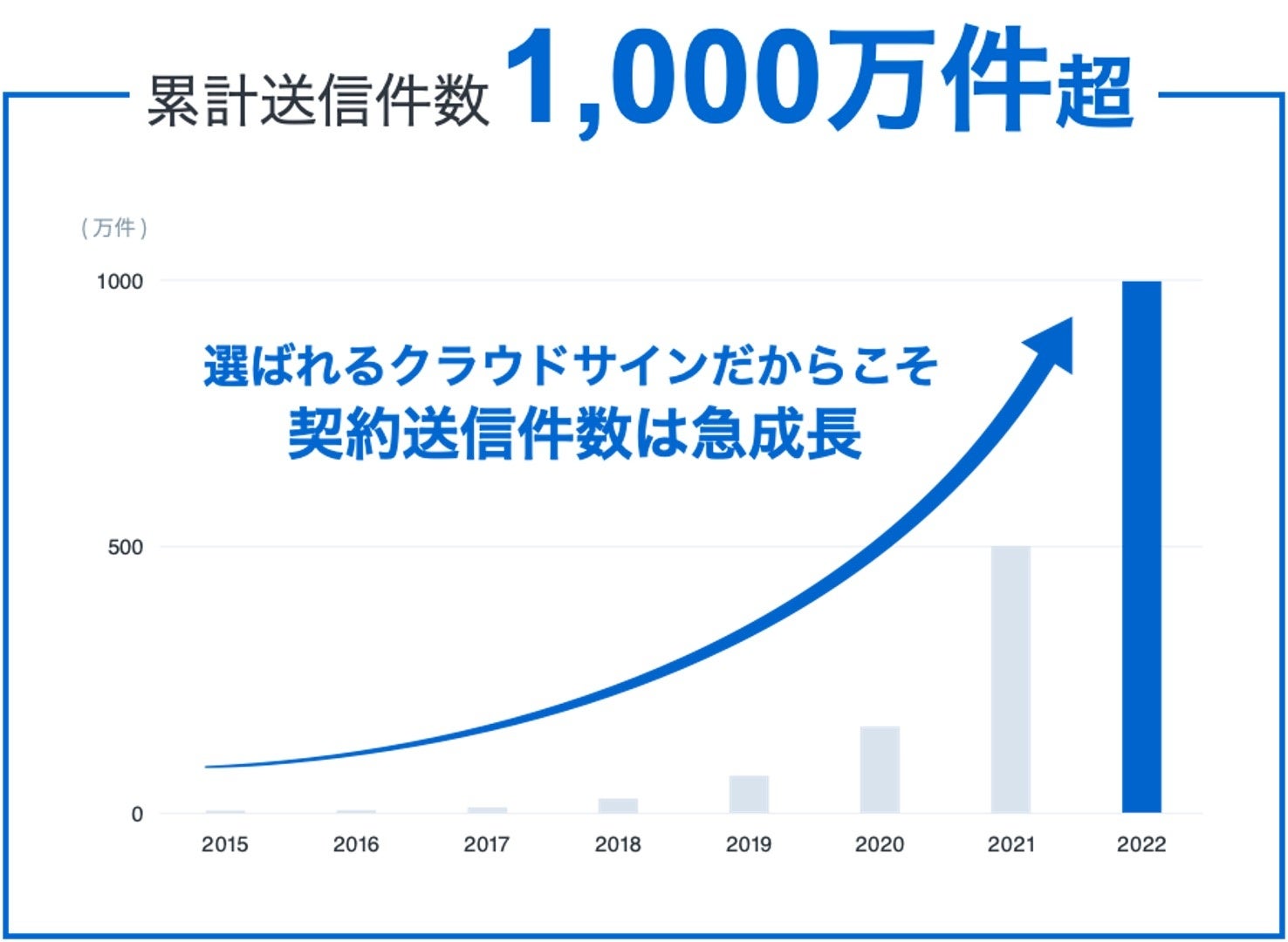 クラウドサインの累計契約送信件数は、2021年5月に発表した500万件到達から約1年で2倍となり、このたび1,000万件を突破いたしました。この背景としては、働き方改革の推進やリモートワークの普及により大企業での利用が促進されたことと、東京都や茨城県、高知県といった地方自治体での利用検討が進むなど、全国でさまざまな分野での利用拡大があげられます。