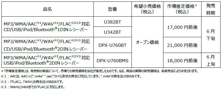 ラインアップは、1DINタイプ2モデルと2DINタイプ2モデルで構成。1DINモデルは、イルミネーションカラーを変更できる「U382BT」(最大1,000色のバリアブルカラー表示に対応)と「U342BT」(3色から選択可能)の2モデルを展開。また、13桁/3行表示に対応する大型LCDを搭載した2DINモデルには、CD再生に対応する「DPX-U760BT」と、新たにデータによる音楽再生に特化したメカレスモデル「DPX-U760BMS」を追加。クルマの仕様や好みに合わせて選択できます。