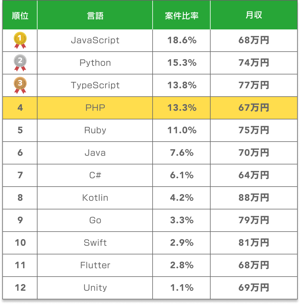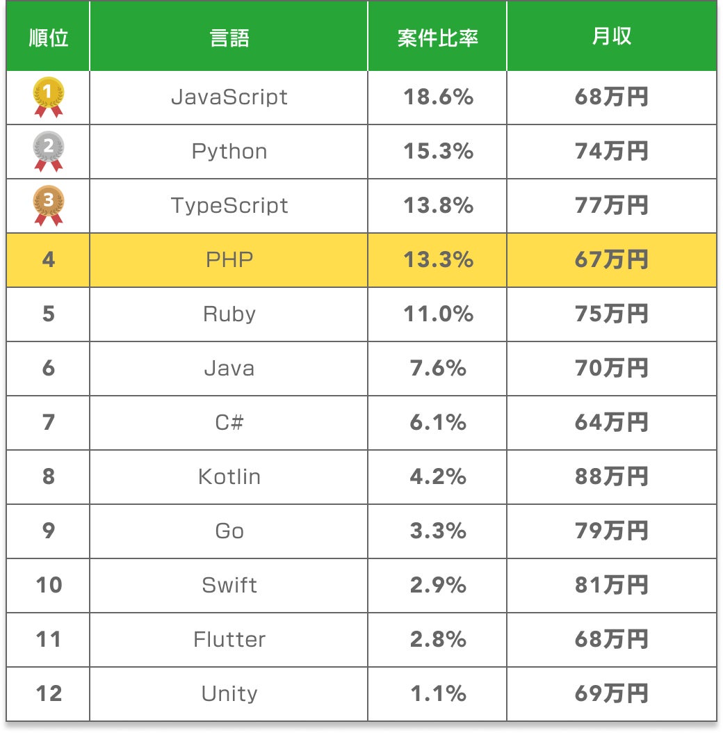 SOKUDANに掲載されているPHP案件は、職種別案件数ランキングで4位、全体の13.3%を占めています。トップクラスの案件数を誇り、フリーランスにとって選択肢の多い言語です。