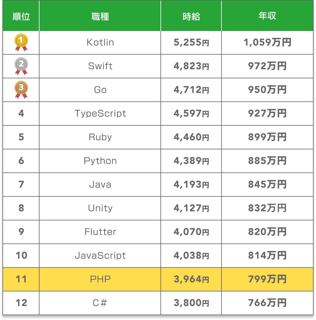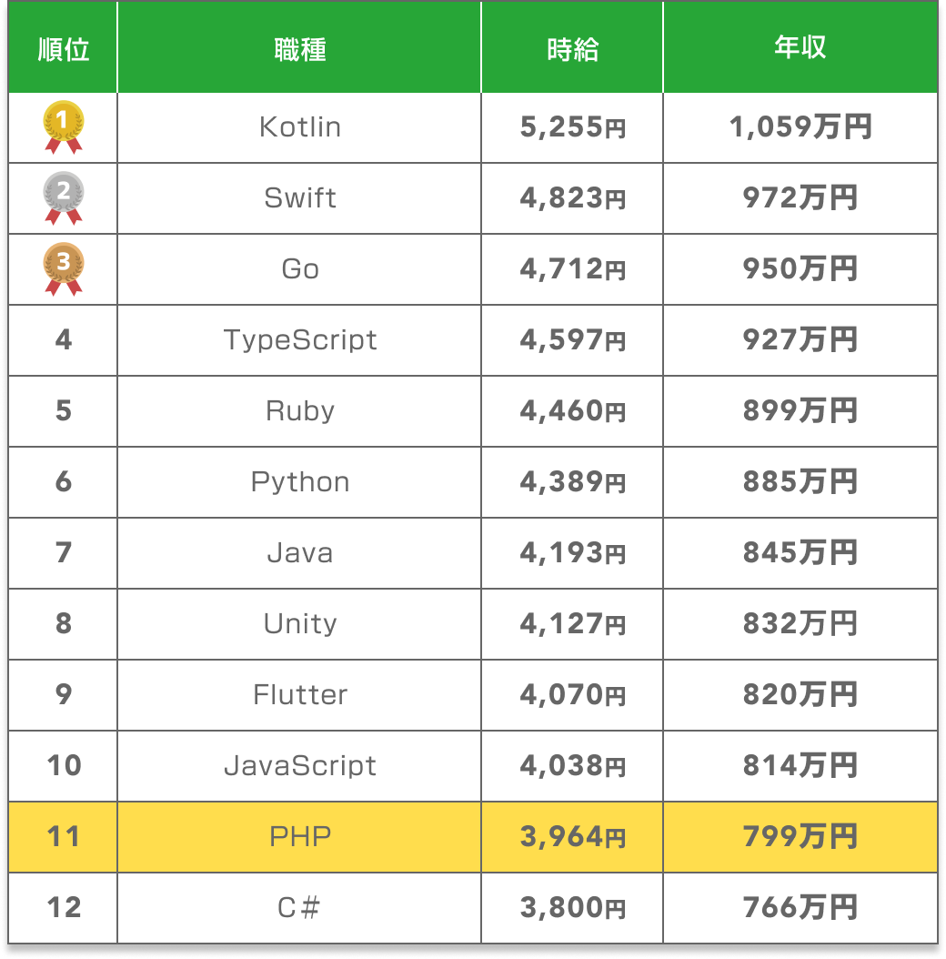 SOKUDANに掲載されているPHP案件の平均年収は799万円です。職種別年収ランキングでは12位中11位ですが、一般的なエンジニアの年収水準と比較すると高い報酬といえます。