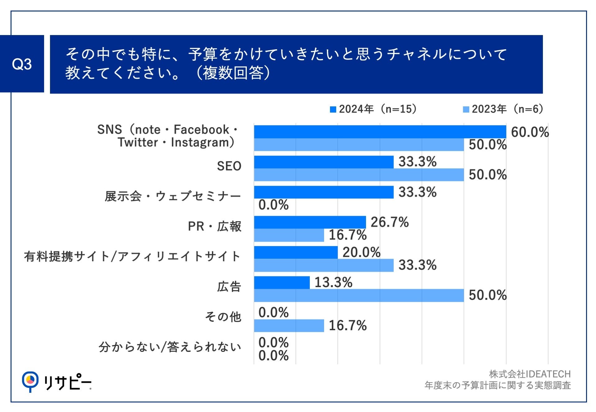 Q1で「増えた」と回答した方に「Q3.その中でも特に、予算をかけていきたいと思うチャネルについて教えてください。(複数回答)」(n=15)と質問したところ、「SNS(note・Facebook・Twitter・Instagram)」が60.0%、「SEO」が33.3%、「展示会・ウェブセミナー」が33.3%という回答となりました。