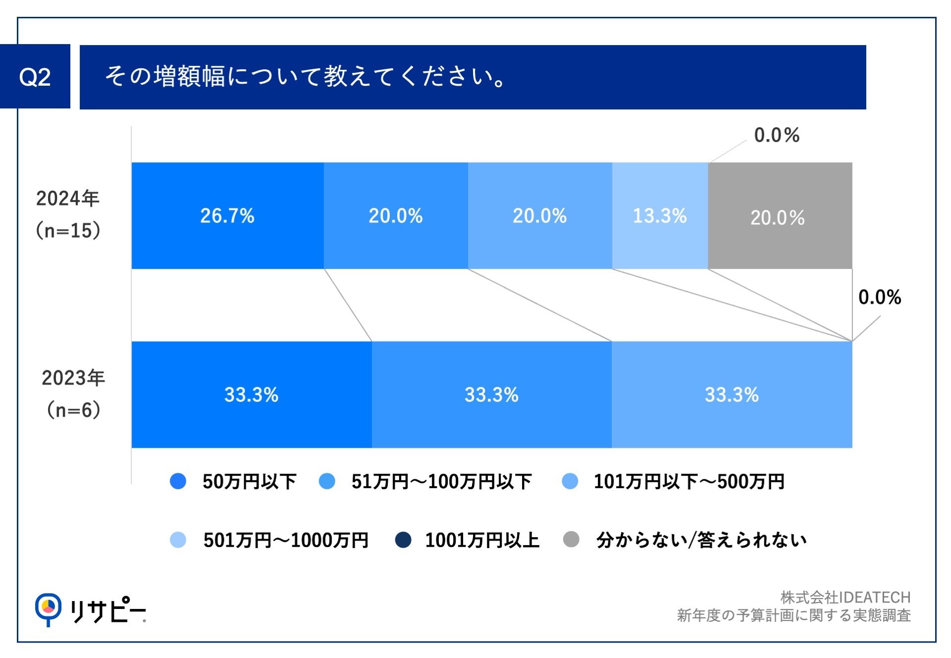 Q1で「増えた」と回答した方に、「Q2.その増額幅について教えてください。」(n=15)と質問したところ、「50万円以下」が26.7%、「51万円~100万円」が20.0%、「101万円~500万円」が20.0%という回答となりました。