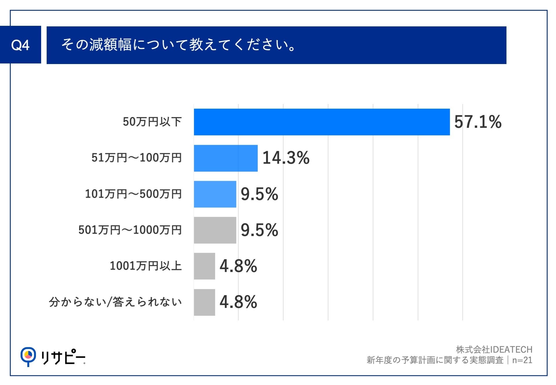 Q1で「減った」と回答した方に、「Q4.その減額幅について教えてください。」(n=21)と質問したところ、「50万円以下」が57.1%、「51万円~100万円」が14.3%、「101万円~500万円」が9.5%という回答となりました。