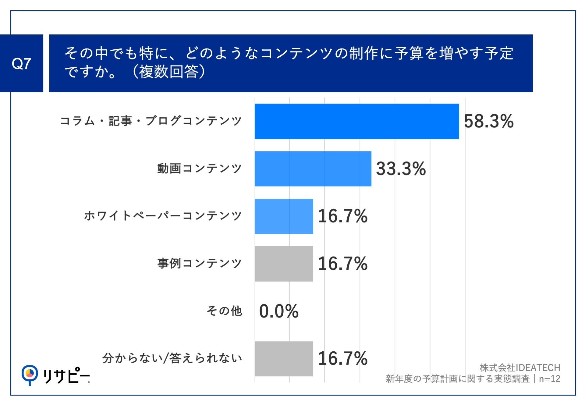 Q6で「増えた」と回答した方に、「Q7.その中でも特に、どのようなコンテンツの制作に予算を増やす予定ですか。(複数回答)」(n=12)と質問したところ、「コラム・記事・ブログコンテンツ」が58.3%、「動画コンテンツ」が33.3%、「ホワイトペーパーコンテンツ」が16.7%という回答となりました。