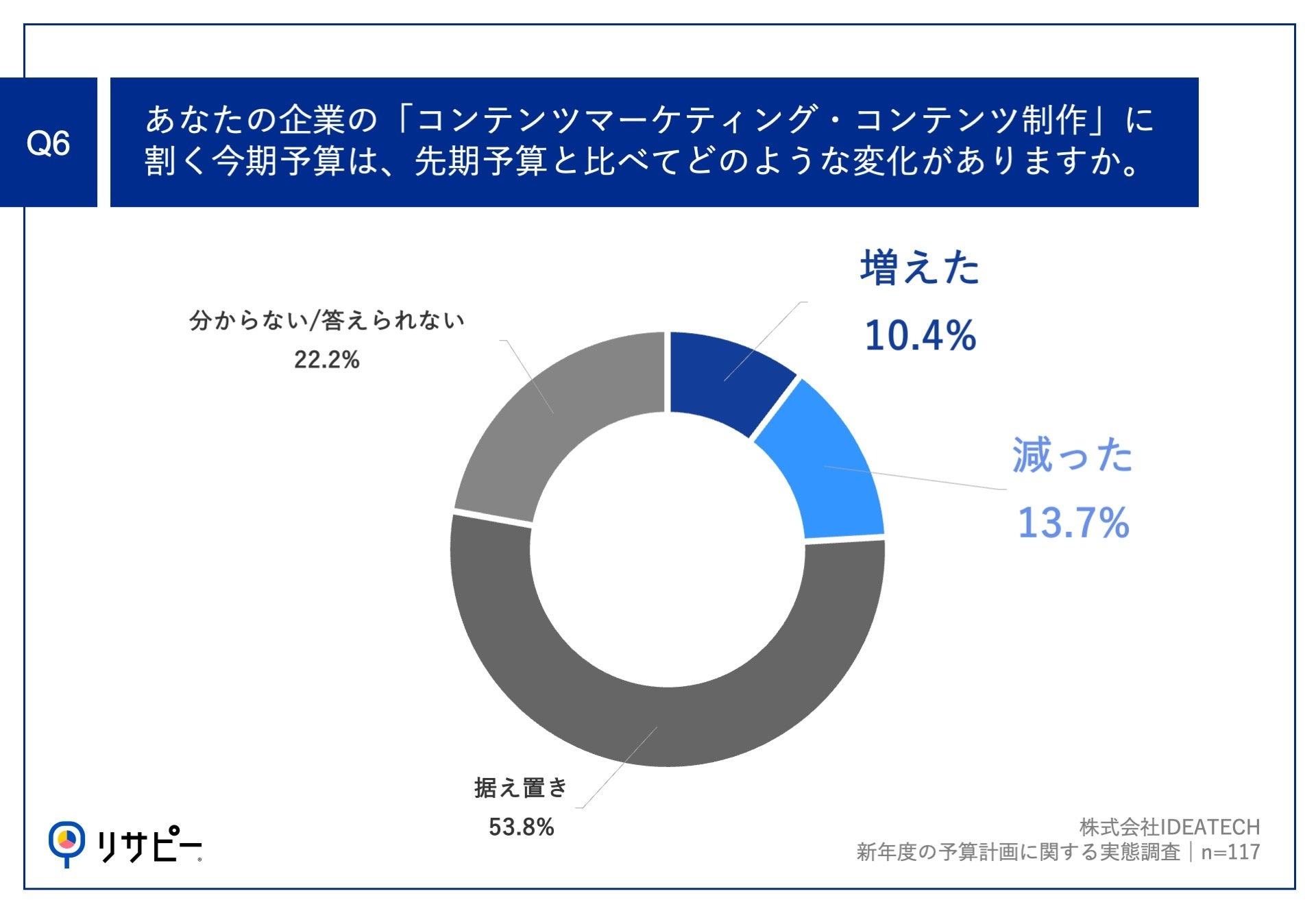 「Q6.あなたの企業の「コンテンツマーケティング・コンテンツ制作」に割く今期予算は、先期予算と比べてどのような変化がありますか。」(n=117)と質問したところ、「増えた」が10.4%、「減った」が13.7%という回答となりました。