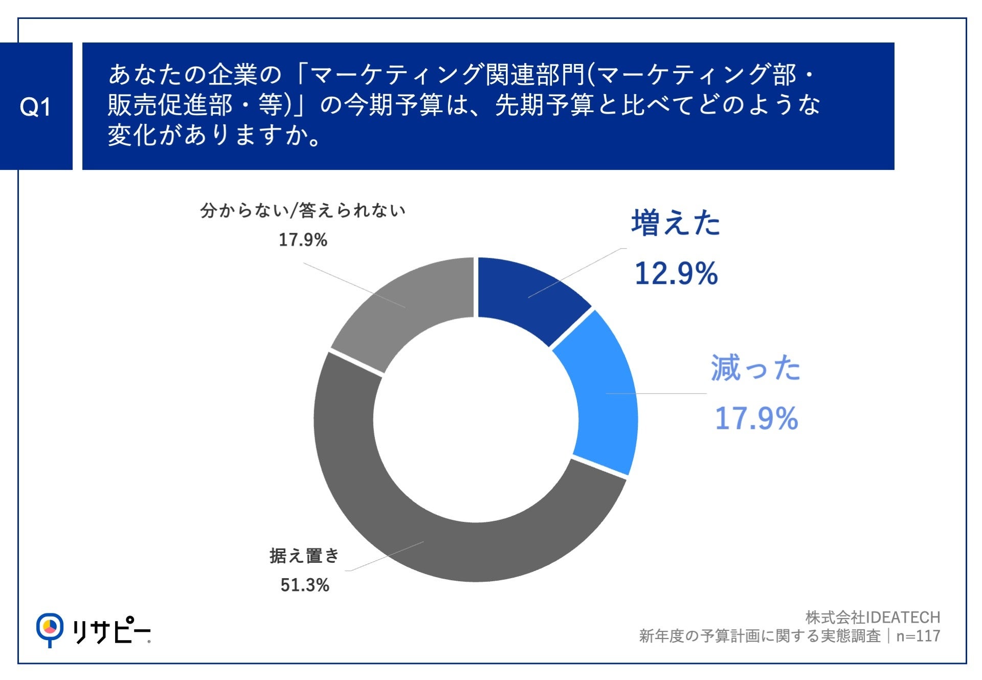 「Q1.あなたの企業の「マーケティング関連部門(マーケティング部・販売促進部・等)」の今期予算は、先期予算と比べてどのような変化がありますか。」(n=117)と質問したところ、「増えた」が12.9%、「減った」が17.9%という回答となりました。