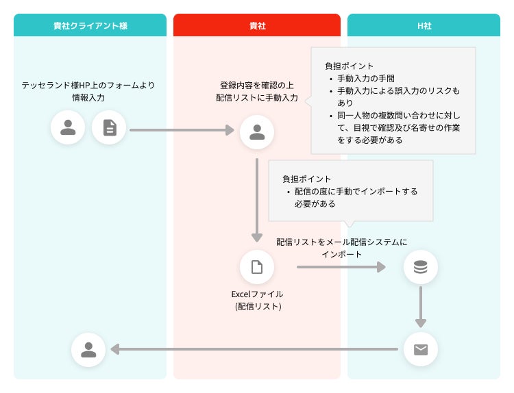 スプレッドシートで顧客情報を管理し、メール配信リストを手作業で作成していたことで誤入力や重複など情報管理のリスクがありました。