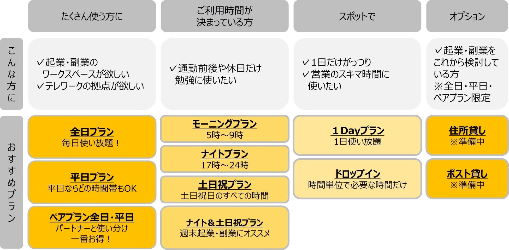 営業時間は5時〜24時で、365日利用可能。ライフ&ワークに合わせて、最適なプランをお選びいただけます。