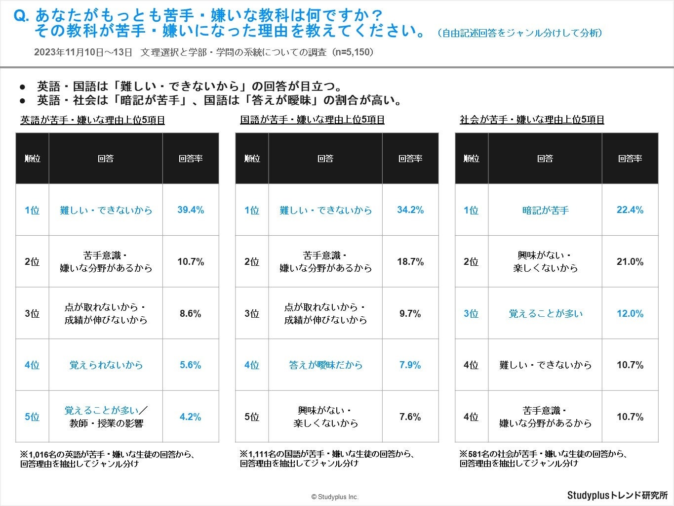 ・英語・国語は「難しい・できないから」の回答が目立ち、英語・社会は「暗記が苦手」、国語は「答えが曖昧」の回答率が高い結果となりました。
