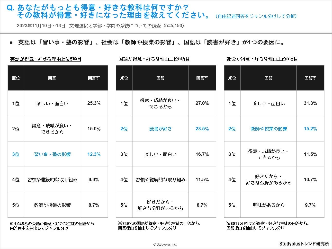 ・文系科目においては、英語は「習い事・塾の影響」、社会は「教師や授業の影響」、国語は「読書が好き」といった回答が特徴的です。