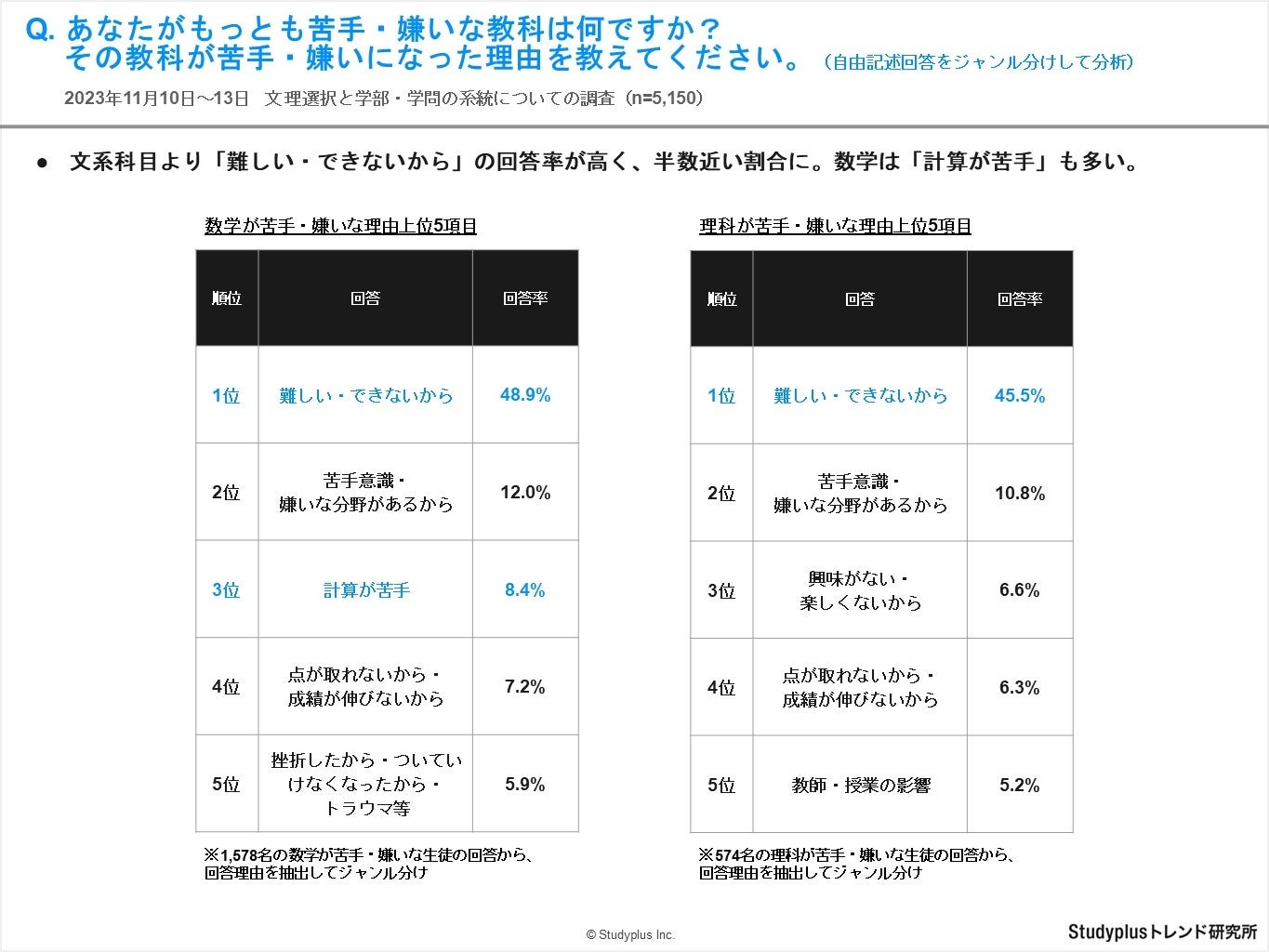 ・理系科目は、文系科目以上に「難しい・できないから」の回答率が高く、半数近い割合。数学は「計算が苦手」も多く見られる結果となりました。