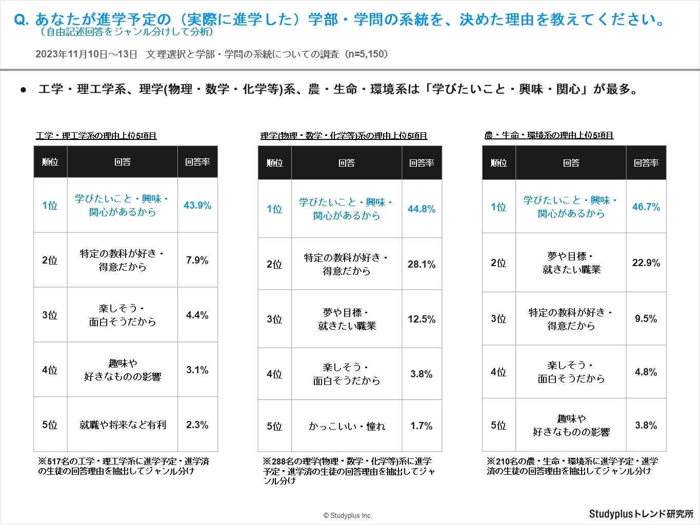 ・理系の学部・学問系統の結果に着目すると、工学・理工学系、理学(物理・数学・化学等)系、農・生命・環境系は「学びたいこと・興味・関心」が最多。医学系、看護系、薬学系は「夢や目標・就きたい職業」が最多という結果が得られました。