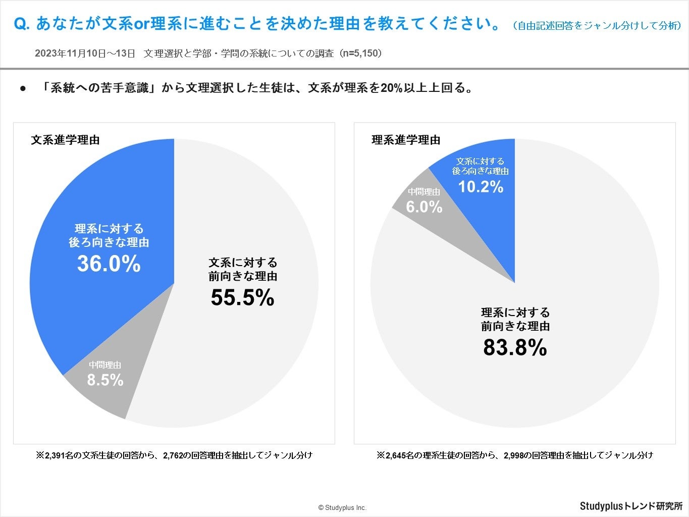 前回調査の結果を受けて、今回は自由記述で文理選択の理由を調査しました。