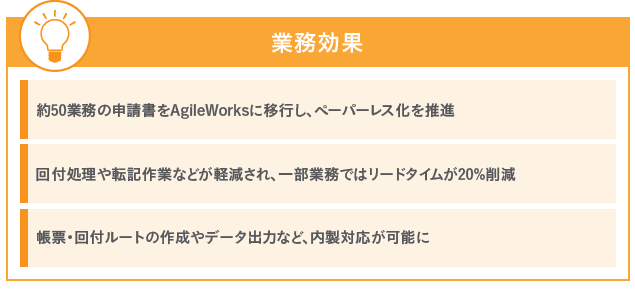 現在、豊田会のほぼすべての職員がAgileWorksを利用できる環境であり、運用開始から半年間での申請数は約10,000件にのぼっています。約50業務の申請書をAgileWorksで運用しており、これまで年間3,000件以上が紙帳票で申請されていた病院内設備の修理などの作業依頼は、AgileWorks移行後は作業全体のリードタイムが約20%短縮された上、作業進捗も可視化されました。