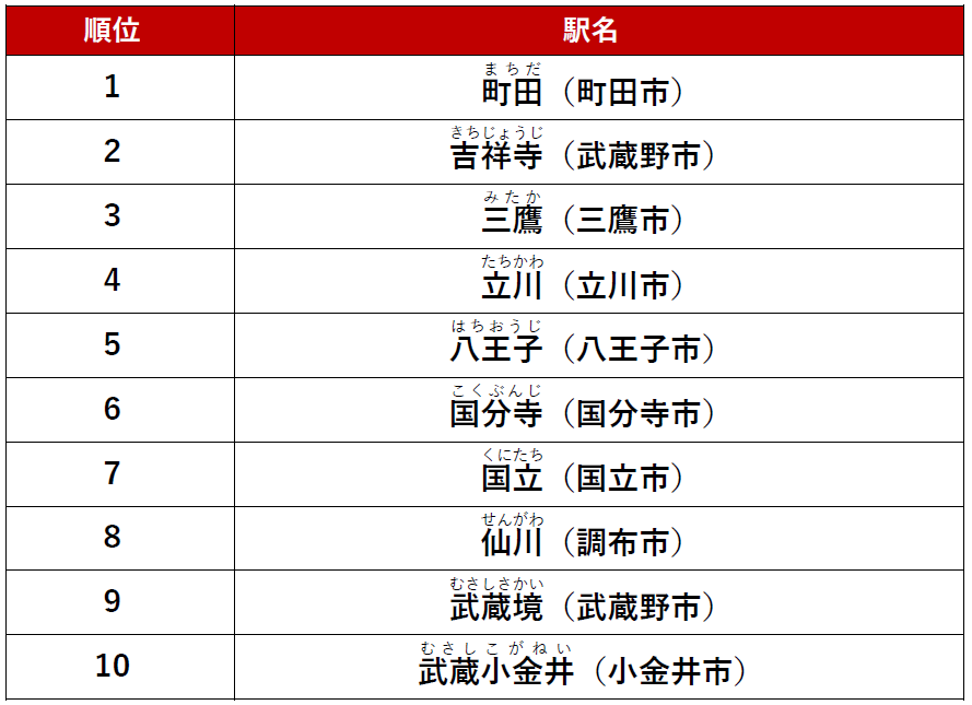 2位に「三鷹」駅、3位に「吉祥寺」駅がランクインしました。