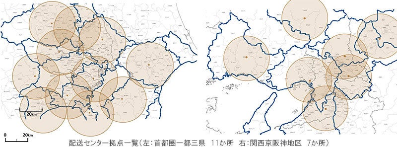 その他時間指定配送、多層階への階上げ搬入、無人納品(指定場所への置き配)等、各納品現場の要望にきめ細かく対応します。対象地区は首都圏一都三県と関西京阪神地区です。18カ所※1の配送センターから各納品現場の希望納期に応じ配送します。