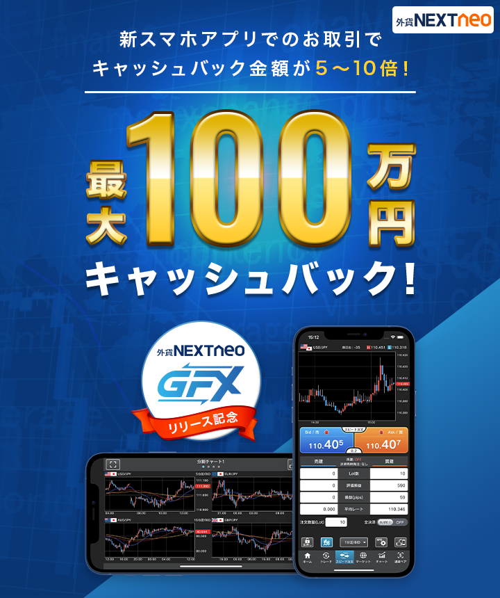 新スマホアプリ、外貨ネクストネオ「GFX」のお取引で米ドル/円を含む対象通貨ペアのキャッシュバック金額が最大10倍になります!