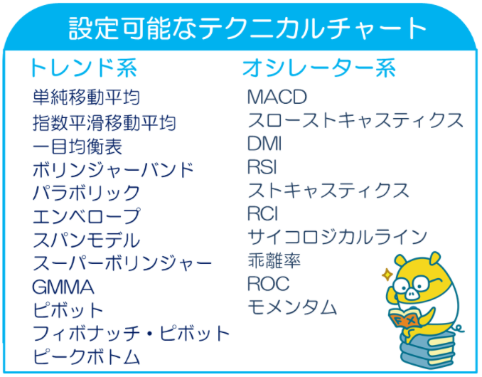 新たに6種類追加され22種類となったテクニカルチャート、最大4通貨ペアまで表示できる分割チャート機能、レートやボラテリティなどで指定した数値に到達するとプッシュ通知が届く機能にも注目です!