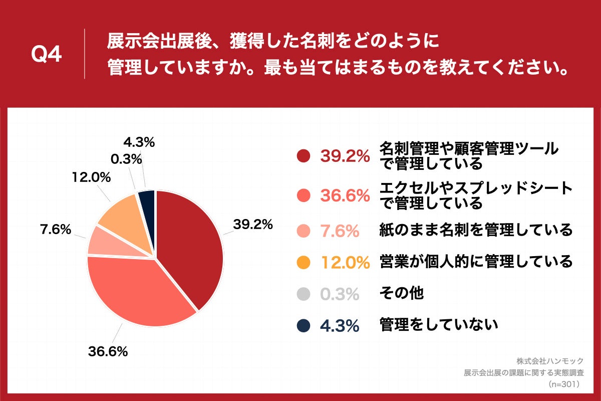 「Q4.展示会出展後、獲得した名刺をどのように管理していますか。最も当てはまるものを教えてください。」(n=301)と質問したところ、「名刺管理や顧客管理ツールで管理している」が39.2%、「エクセルやスプレッドシートで管理している」が36.6%という回答となりました。