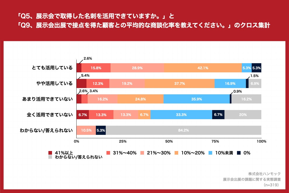 また、名刺を「とても活用している」「やや活用している」との回答群は、8割以上が平均商談化率10%以上であるのに対し、「あまり活用できていない」「全く活用できていない」との回答群は約6割に留まりました。