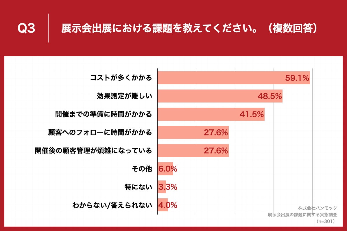 - 展示会出展における課題、「コスト」が約6割で最多、他にも約3割が「開催後の顧客管理」と回答
