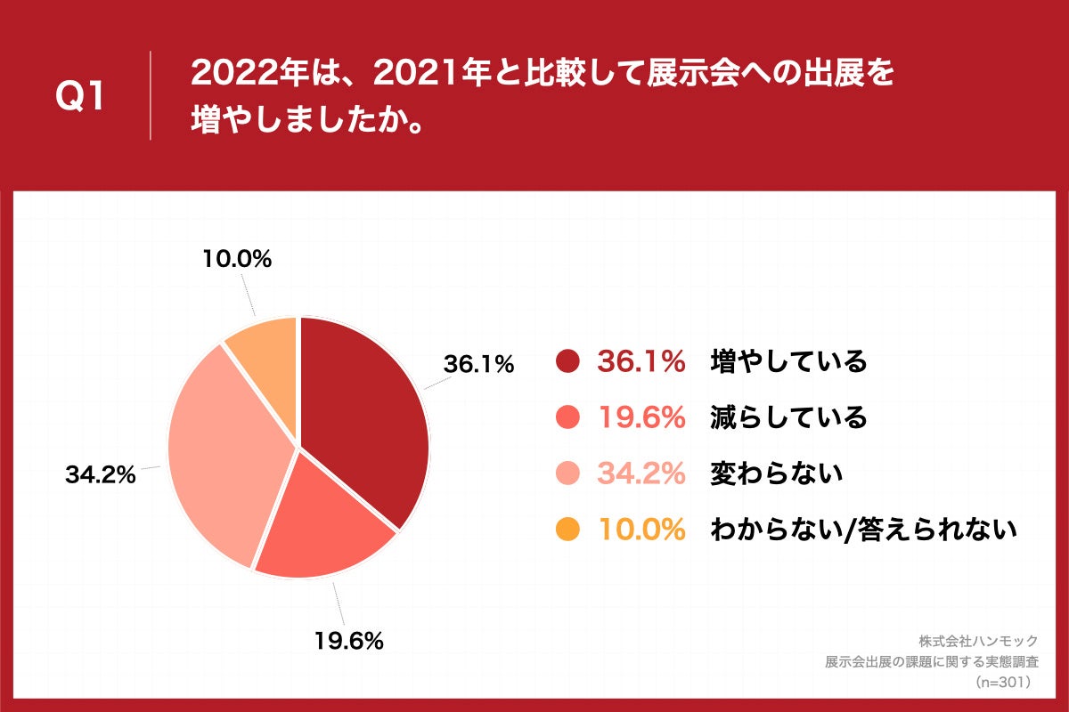 「Q1.2022年は、2021年と比較して展示会への出展を増やしましたか。」(n=301)と質問したところ、「増やしている」が36.1%、「減らしている」が19.6%という回答となりました。