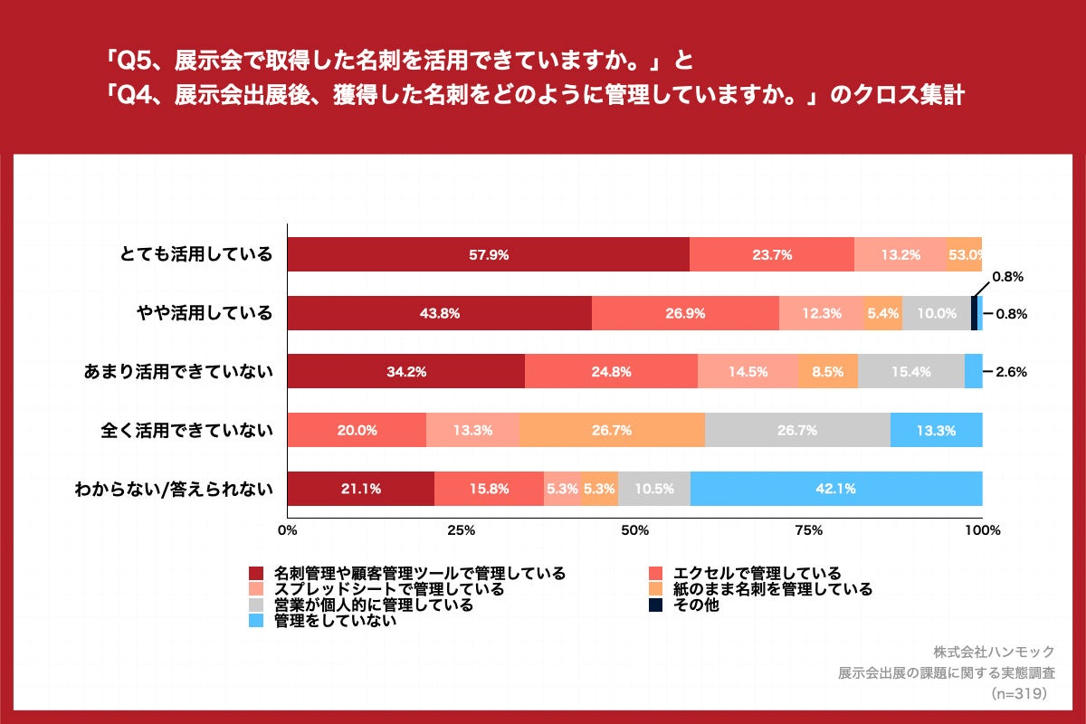 さらに、「Q5.展示会で取得した名刺を活用できていますか。」で「とても活用している」「やや活用している」と回答した人ほど、「名刺管理ツール」や「顧客管理ツール」といったデジタル管理基盤を採用しており、「あまり活用できていない」「全く活用できていない」と回答した人ほど、エクセルや紙での管理、営業担当者の個人的な管理に留まっているケースが多いことが判明しました。