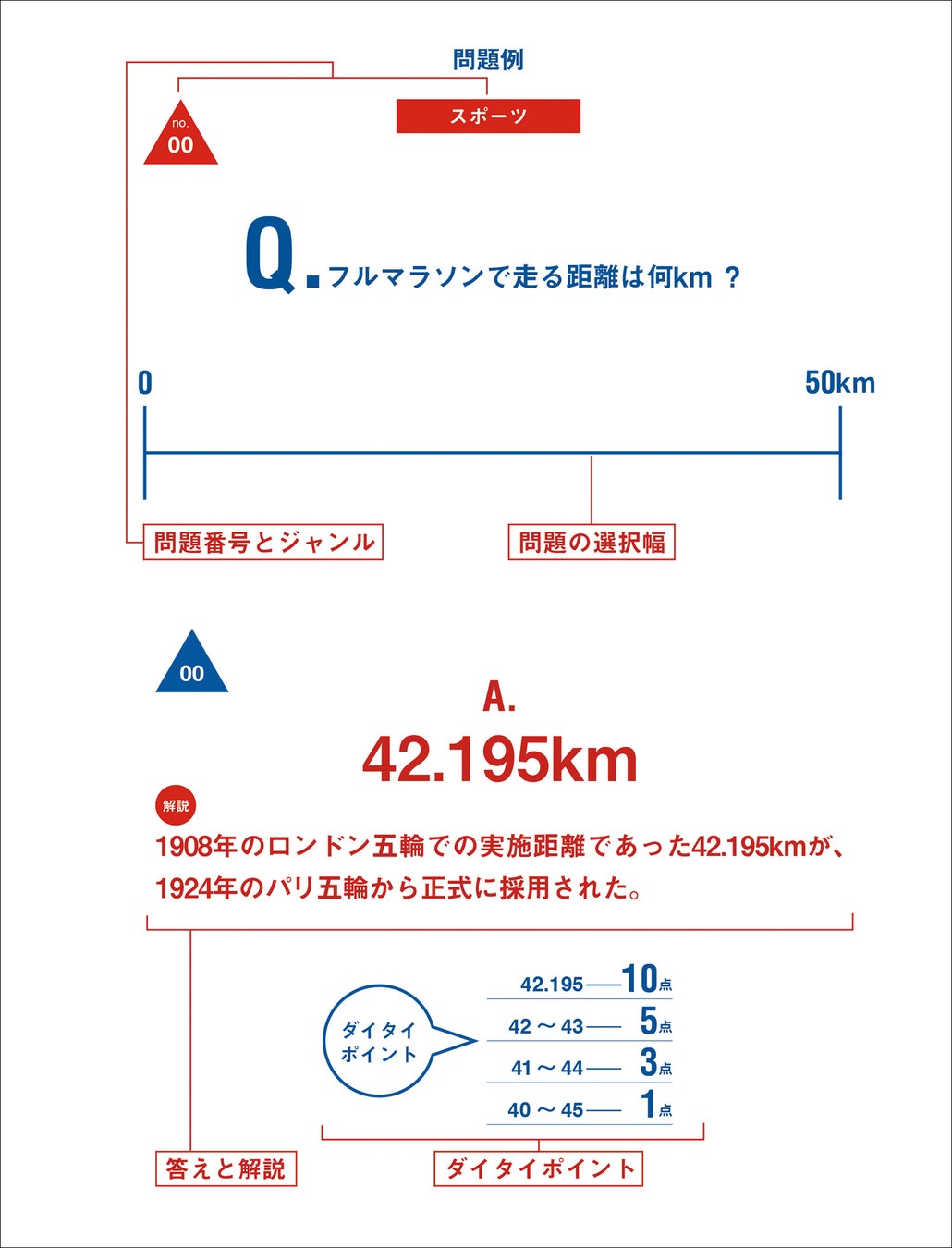 本書は問題文の下に答えの数字の選択幅が数直線で記されています。その下限から上限までの数字の中から、答えだと思った数字を決めます。そのあと、ページをめくると答えと解説が書かれており、答えだと思った数字の範囲に応じて「ダイタイポイント」を獲得できます。