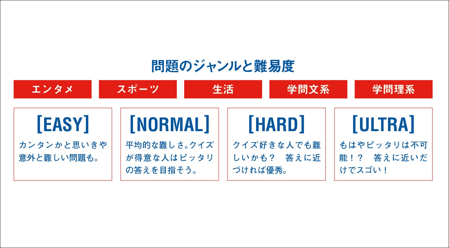 クイズのジャンルは「エンタメ」「スポーツ」「生活」「学問文系」「学問理系」の5つ。難易度は[EASY]〜[HARD]に加え、アプリ版にはない最難度の[ULTRA]を追加しました。