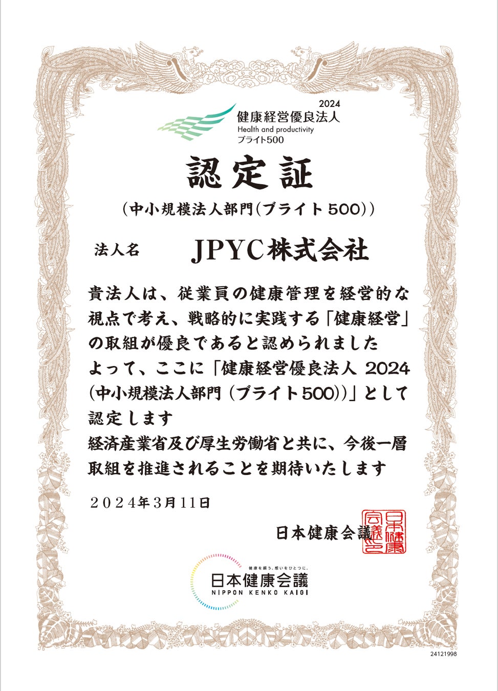 日本円ステーブルコインのJPYC|「健康経営優良法人2024(中小規模法人部門(ブライト500))」認定のお知らせ
