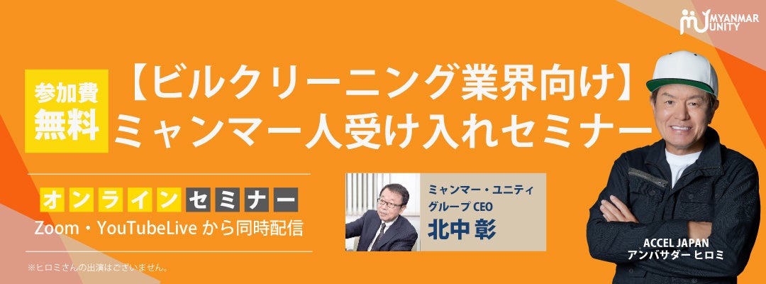 ミャンマー政府認定圧倒的No.1人材送り出し機関「ミャンマー・ユニティ」は、4月24日(水)に開催した「【ビルクリーニング業界向け】ミャンマー人受け入れセミナー」の動画を無料公開いたします。