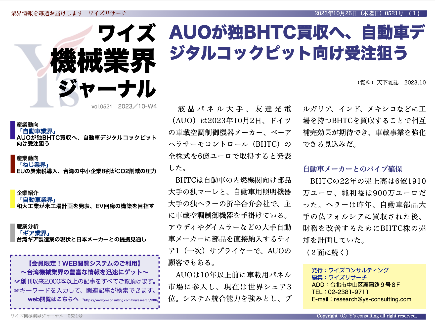 【台湾情報】AUOが独BHTC買収へ、自動車デジタルコックピット向け受注狙う<ワイズ機械業界ジャーナル2023年10月第4週号発行>