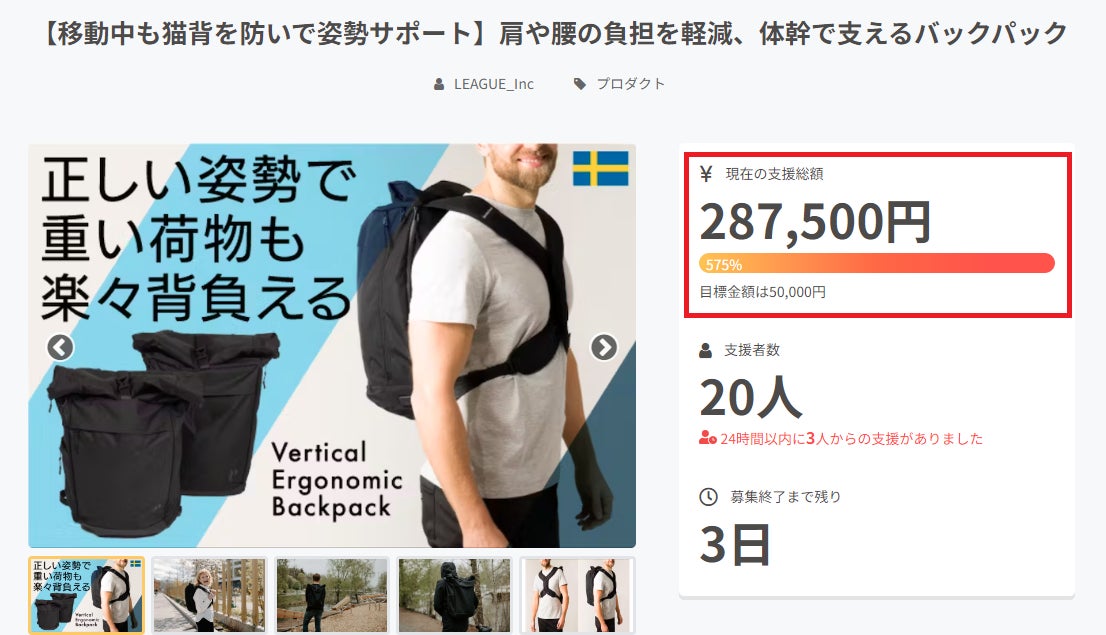 株式会社LEAGUE(本社:東京都武蔵野市)は、体の姿勢をサポートするを理念に作り上げられたオシャレで機能的なバックパック「Vertical Ergonomic Backpack」のクラウドファンディングを、2024年2月9日(金)18:00よりクラウドファンディングサイト「CAMPFIRE」より開始しました。