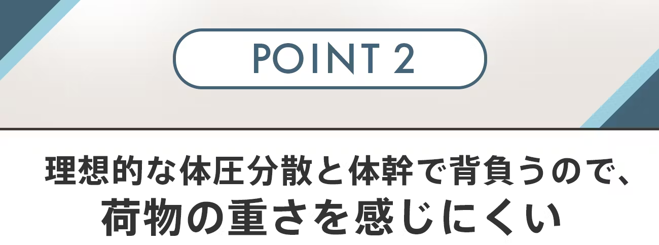 また「姿勢垂直システム」により体を真っすぐに保つため、体幹で荷物を支え重さを体全体に分散します。