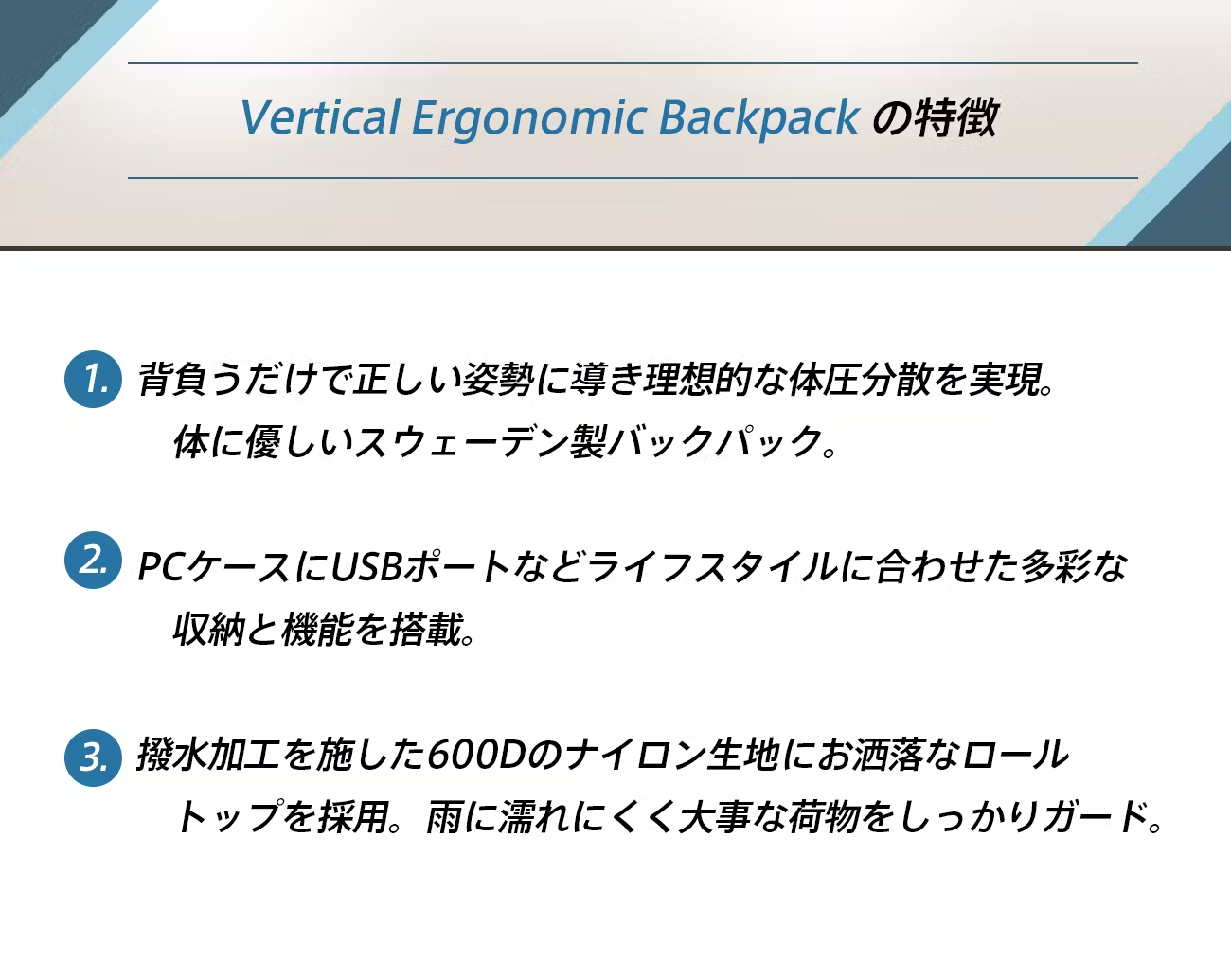 【Vertical Ergonomic Backpack】は「体の姿勢をサポートする」を企業理念に作り上げたお洒落で機能的なバックパックです。