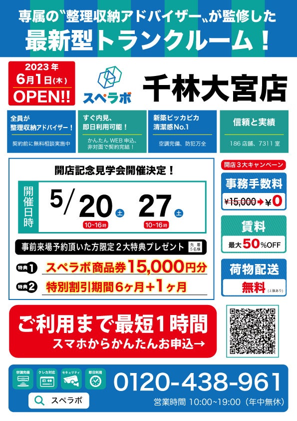 【千林大宮店/6月1日(木)オープン】見学から契約、解約まで完全非接触・非対面、お申し込みからご利用まで最短1時間!都内、大阪などにて絶賛運営中のトランクルーム【スペラボ】が千林大宮駅近くに出店!