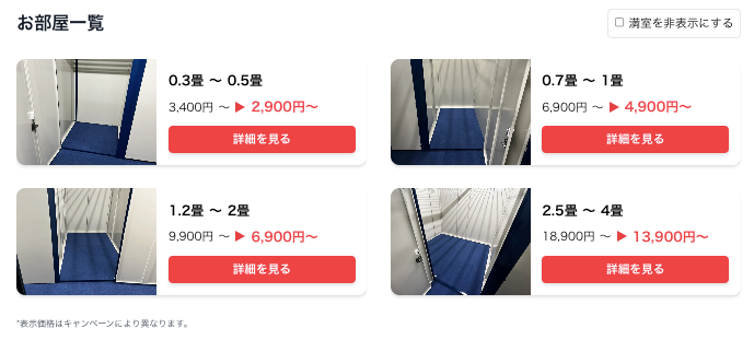 部屋タイプとサイズ、月額料金はこちら