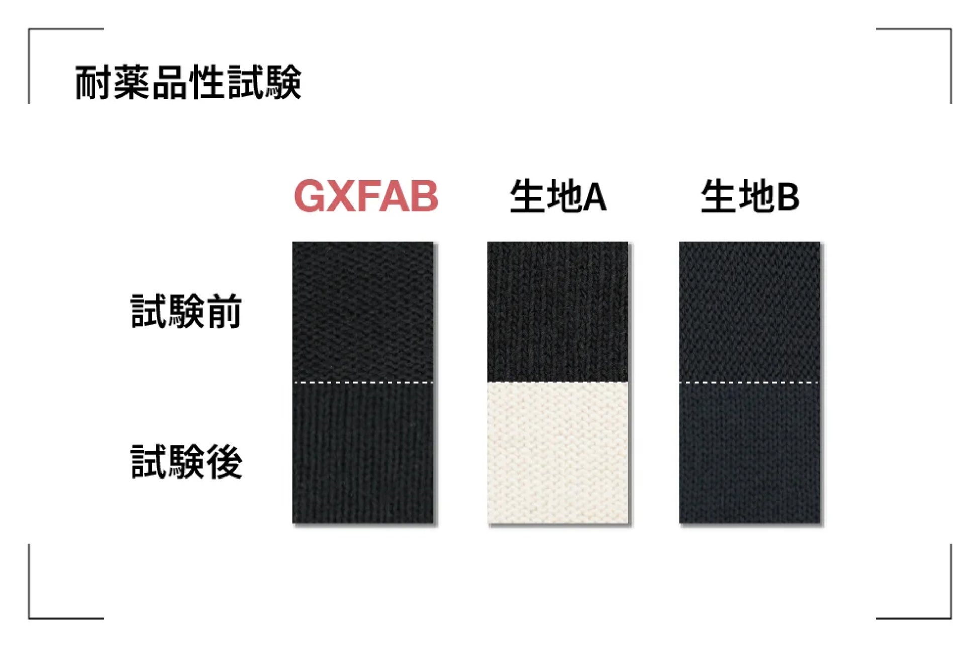 『GXFAB』の生地は様々な条件下でも色褪せに強く、様々な強度試験により生地の信頼性を確認しています。以下は第一弾生地の試験結果、開発中の第二弾ファブリック生地も同様の試験を実施予定です。