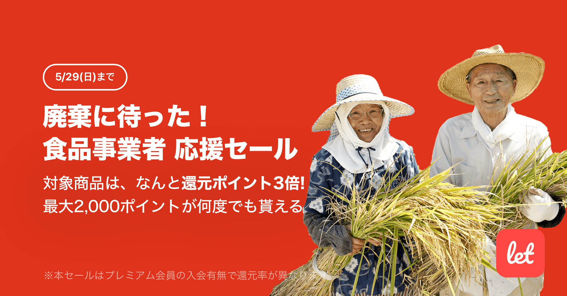 株式会社レット(本社:東京都港区、代表:佐藤 航陽)が運営する、食品ロス削減アプリ「Let(レット)」内で「廃棄に待った!食品事業者 応援セール」を5月27日(金) 18:00より開催します。期間中、プレミアム会員様限定で対象の食品をご購入いただくと、2,000ポイントを上限に還元ポイントが3倍になります。期間中のご購入であれば、ポイント還元はお一人様あたり何度でもご利用いただけます。