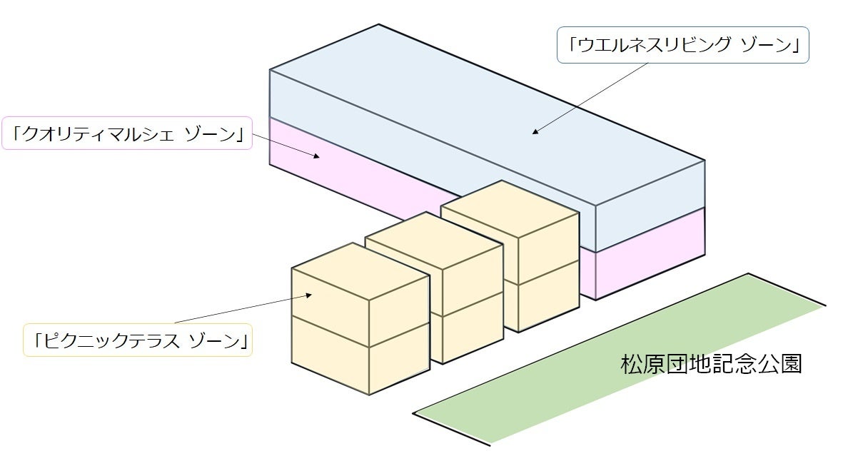 本施設は近接する公園に開かれ心地よいテラスのある「ピクニックテラスゾーン」をはじめ、食をメインとした「クオリティマルシェゾーン」、生活を豊かにする「ウエルネスリビングゾーン」の3つのゾーンで構成し、心地よい暮らしを訴求します。
