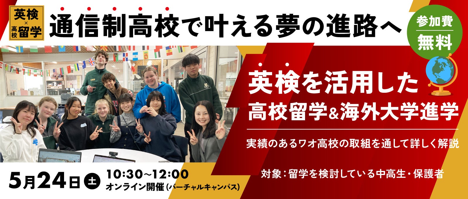 5月24日(土)開催の留学セミナーは「通信制高校で叶える 英検×高校留学による国内・海外大学進学のススメ」です。英検を効果的に活用することで英語力を伸ばし、さらに留学につなげていくという学び方で、ワオ高校では多くの留学実績を上げています。「留年せずに留学できるって本当?」「留学するのに英語力はどれくらい必要?」「海外大学に行くために必要なことって何?」―。今回のセミナーでは、皆さまから寄せられる数々の疑問や不安について、ワオ高校での実例を挙げながら詳しくお伝えします。留学に興味のある中学生、高校生、保護者の皆さま、ぜひご参加ください。