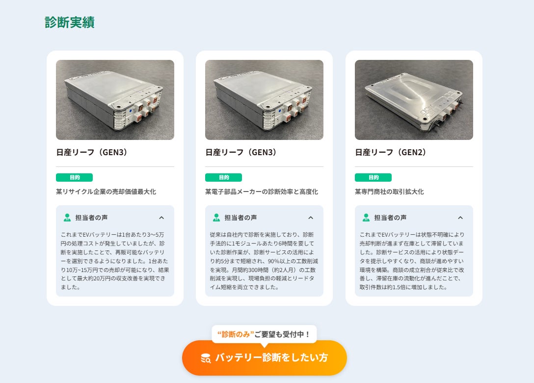 リパーパス製品メーカー担当者は、次のように述べています。「診断時間の短縮に加え、実測値比で±5%以内という精度の高さに驚いています。これまで自社で充放電による診断を行っていましたが、SOH精度が担保された状態で仕入れられる点は、今後の調達において大きな価値があると感じています。」