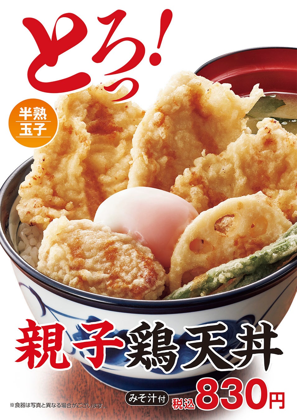 『親子鶏天丼』は、てんやで人気の「とり天」が3枚、サクッとした食感を楽しめる「れんこん」、「いんげん」、華味鳥を使用した「つくね」に半熟玉子をのせ、ボリューム満点な天丼に仕上げました。